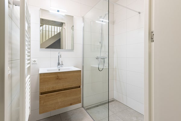 Il bagno è moderno e dispone di una spaziosa doccia a filo pavimento e di un lavabo con mobile. Infine, c'è un bagno separato su questo piano.