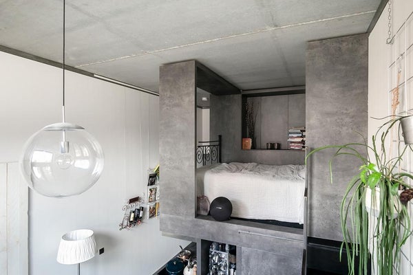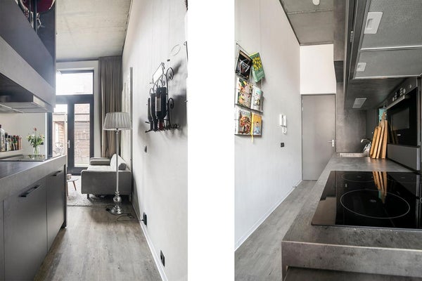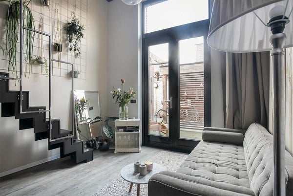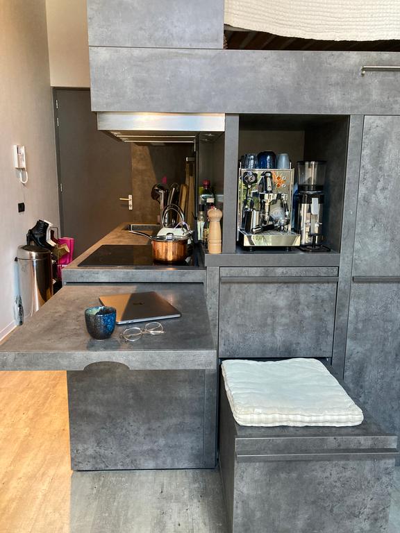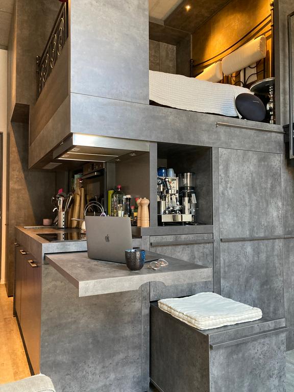Il micro appartamento presenta un design elegante con soffitti alti (circa 3,70 metri) ed è dotato di tutti i comfort moderni, armadi a muro e molto spazio di stoccaggio.