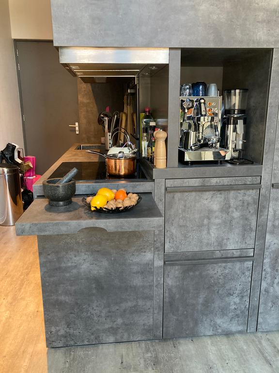 Soggiorno/locale pranzo con cucina di lusso, che dispone di una lavastoviglie, forno combinato/microonde, frigorifero con congelatore, piano cottura in ceramica a 4 fuochi e cappa aspirante. La cucina presenta anche un piano d'appoggio allungabile e una panca allungabile.