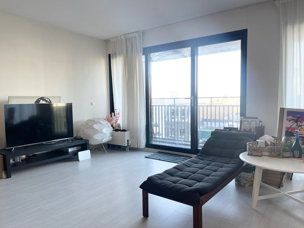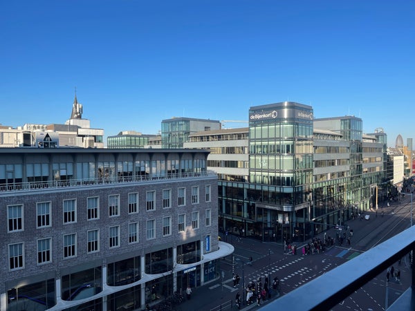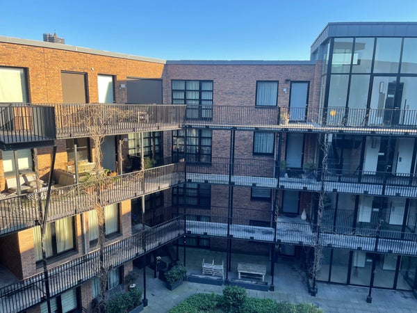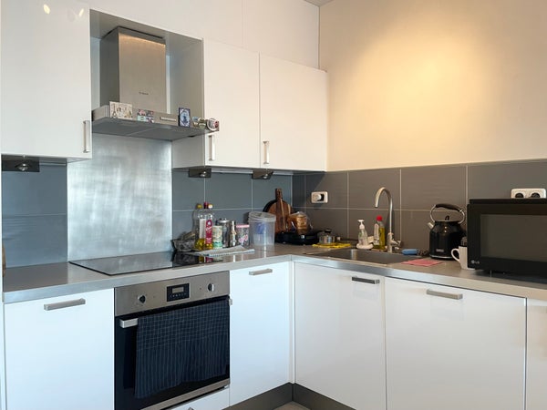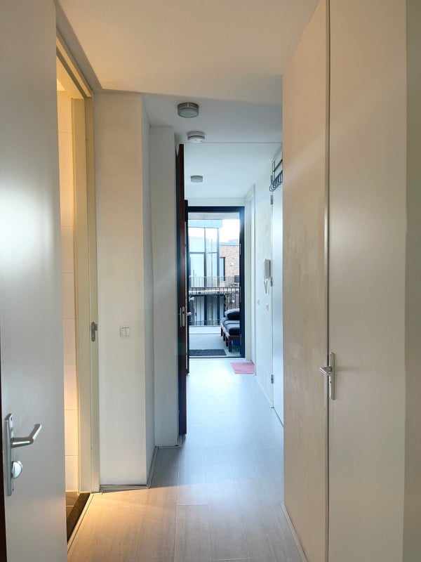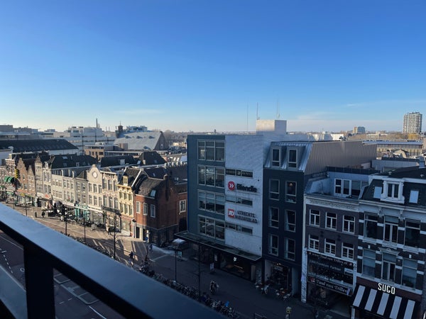 Un ingresso comune, dotato di ascensore. L'appartamento si trova al 5° piano. Davanti alla porta d'ingresso c'è un piccolo spazio privato per un salotto. Un lungo corridoio ti conduce al soggiorno con cucina a vista. Il soggiorno è molto spazioso, con grandi porte scorrevoli che conducono al balcone, dove si ha una vista su Vredenburg, una strada molto accogliente con la splendida Bijenkorf. La cucina è dotata di cappa, frigorifero-congelatore integrato, forno integrato, piano cottura a induzione e lavastoviglie.