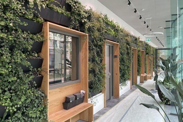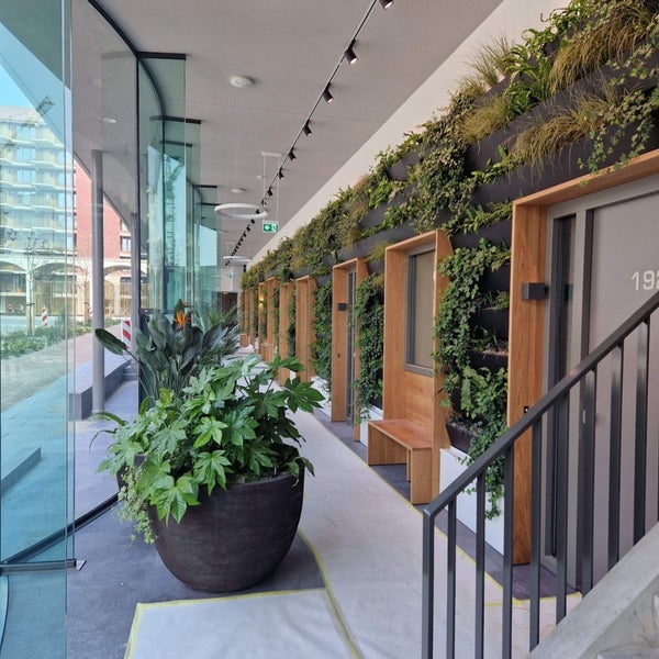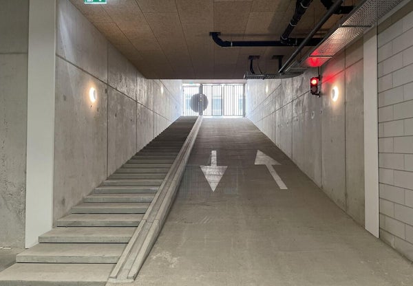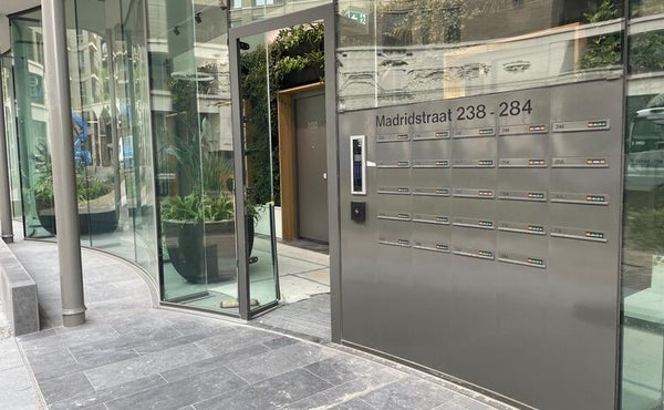 L'ingresso centrale è una vera Urban Jungle che ti fa subito avere una sensazione di zen. Con un citofono e un ascensore, c'è accesso ai piani e al garage. Questo appartamento ha un posto auto privato nel garage sotterraneo. Qui si trova anche il ripostiglio che appartiene all'appartamento. I piani sono accessibili sia tramite ascensore che scala.