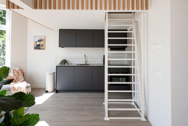 "La torre studio!" Ingresso al piano terra, corridoio. Porta di ingresso dell'appartamento. Entrata dell'appartamento con corridoio. Quando entri nel soggiorno, a destra troverai una bella cucina con forno/combinazione microonde, lavastoviglie, piano cottura a induzione, rubinetto Quooker per acqua bollente e un bel piano in pietra naturale. La zona notte si trova nell'area living ed è accessibile tramite una bella scala bianca. Il bagno (fornito di lavabo e doccia a pioggia) è accessibile dal lato sinistro di questo bel studio. Accesso al spazioso giardino privato, esposto a sud, attraverso le porte francesi.