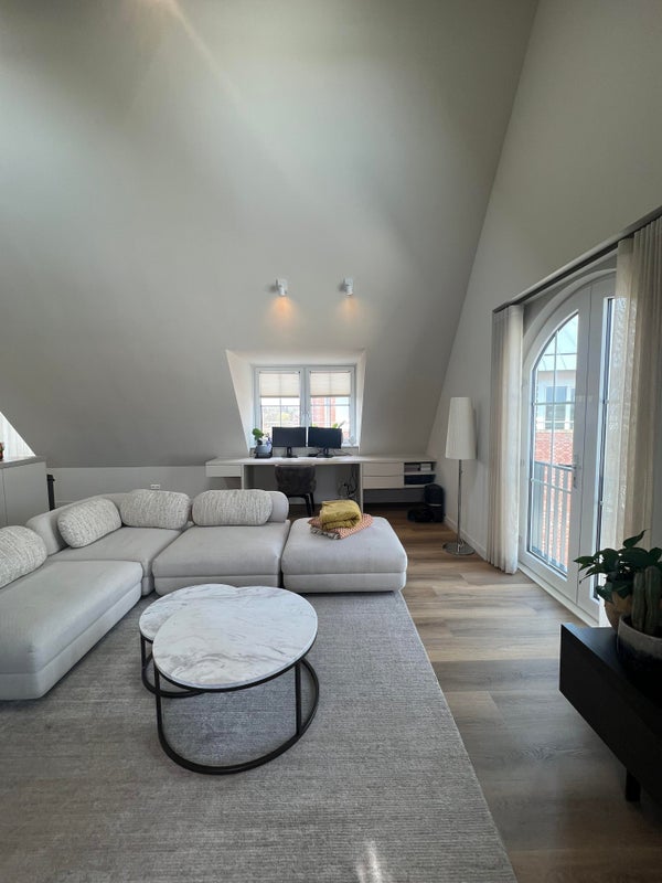 Il soggiorno è luminoso e ben organizzato grazie alle grandi finestre, il che assicura uno spazio abitativo aperto e gradevole. La cucina aperta si integra perfettamente ed è modernamente attrezzata con elettrodomestici, tra cui piano cottura a induzione, forno, lavastoviglie, frigorifero e freezer. C'è accesso al spazioso balcone sia dal soggiorno che dalle altre stanze.