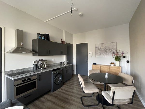 L'appartement de 42 m² est astucieusement agencé et dispose d'une cuisine ouverte, équipée d'une hotte aspirante, d'une plaque de cuisson à induction, d'un four combiné micro-ondes et d'un réfrigérateur-congélateur. La salle de bain est équipée d'une spacieuse douche à l'italienne et d'un meuble lavabo élégant. Il y a aussi un WC flottant séparé.