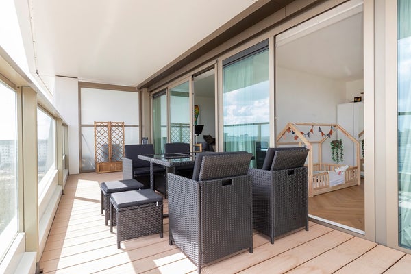 À travers les portes coulissantes, vous pouvez accéder depuis le salon et les deux chambres à la vaste terrasse d'environ 25m2.