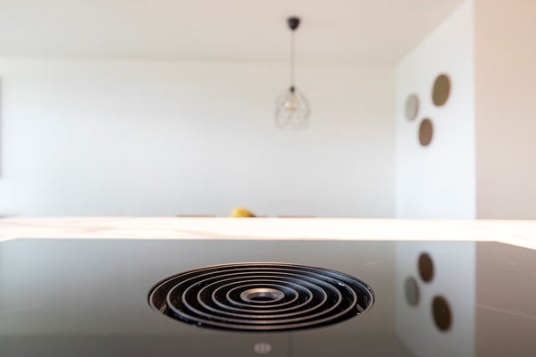 La belle cuisine ouverte avec îlot est équipée d'un lave-vaisselle, d'un réfrigérateur, d'un congélateur, d'une cuisinière, d'une plaque de cuisson à induction à quatre feux, d'un four, d'un micro-ondes et d'une hotte aspirante.