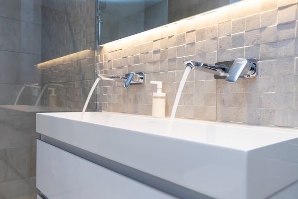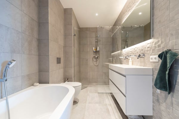 La belle deuxième salle de bain dispose d'une douche à l'italienne, d'une baignoire, de toilettes et d'un lavabo.