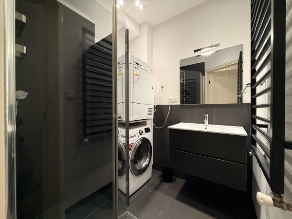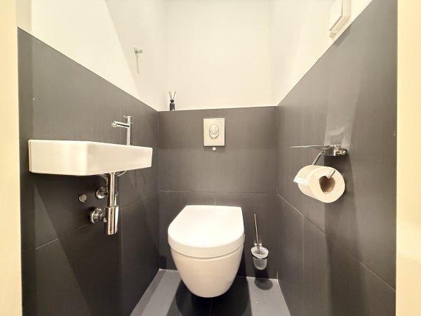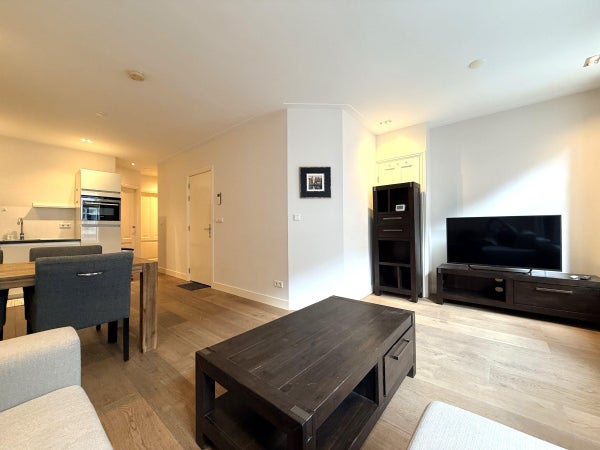 Agencement : entrée centrale avec escalier menant au premier étage. Entrée de l'appartement dans le salon lumineux et la cuisine ouverte moderne équipée d'un réfrigérateur, d'un congélateur, d'un lave-vaisselle, d'une cuisinière à gaz 5 feux avec hotte et d'un inventaire de cuisine complet. À l'arrière de la maison se trouvent les 2 chambres. La chambre principale est équipée d'un lit double et d'un grand mur de placard. L'autre chambre, plus petite, donne accès à un balcon très spacieux avec un coin salon. La salle de bain est équipée d'une douche, d'un meuble lavabo et d'un radiateur design. Les toilettes avec lavabo sont séparées.