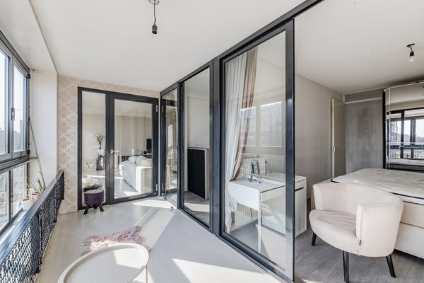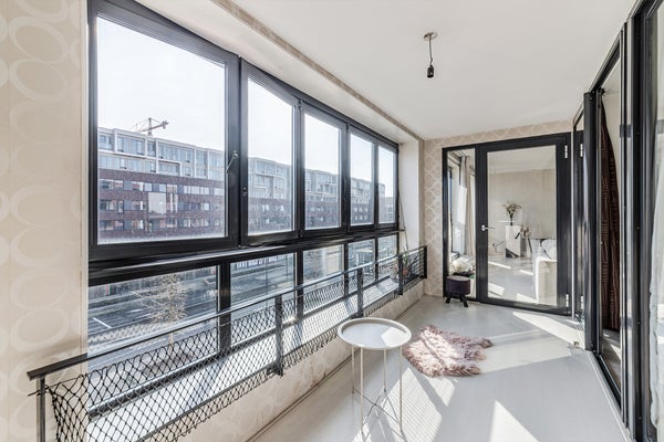 Appartement spacieux de trois pièces situé au quatrième étage d'un immeuble d'appartements bien entretenu dans le centre d'affaires d'Amsterdam-Zuidoost. L'entrée de l'appartement se trouve au rez-de-chaussée, adjacent au jardin intérieur commun. Depuis le hall, l'accès au quatrième étage se fait par l'escalier où se trouve l'appartement.
