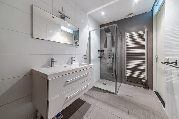 L'appartement dispose de deux chambres bien dimensionnées et est inondé de lumière naturelle. La salle de bains est équipée d'une douche à l'italienne et d'un lavabo. Il y a aussi des toilettes séparées sur le palier.