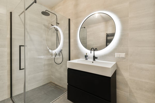 Deuxième étage : hall/entrée avec armoire de compteur et buanderie, toilettes avec lavabo avec carrelage moderne, salle de bain avec douche à l'italienne et double lavabo.