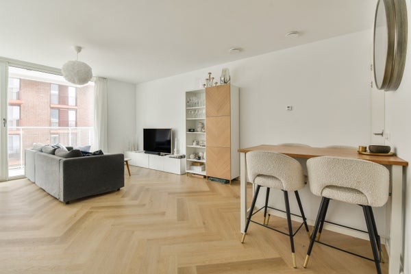 Le salon a des fenêtres du sol au plafond qui donnent accès au balcon, parfait pour profiter du soleil tout en surplombant le fleuve IJ.