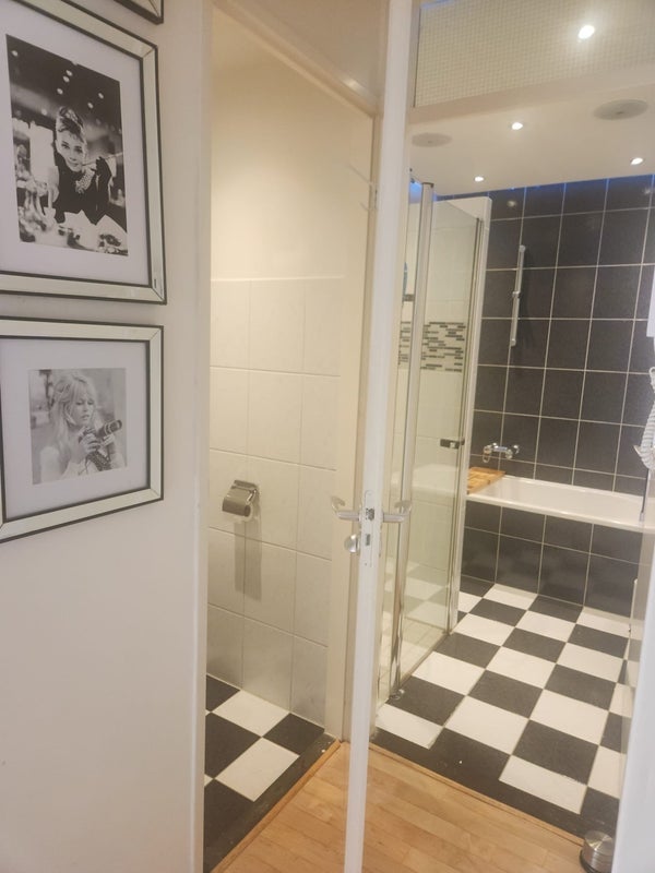 La chambre est située du côté calme de l'appartement et offre un endroit confortable pour se détendre. La pièce est suffisamment spacieuse pour un lit double et un espace de rangement, et elle possède une atmosphère agréable et paisible. La salle de bain est soigneusement terminée et comprend une douche, un lavabo et des équipements modernes. L'appartement est loué entièrement meublé.