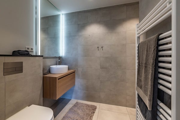 À côté de la chambre principale se trouve la deuxième chambre, qui dispose également d'un lit confortable et d'un placard intégré. La chambre principale et la deuxième chambre disposent chacune d'une salle de bain attenante. Les salles de bain ont un lavabo moderne avec meuble, une douche moderne, un WC et un radiateur de serviettes. Les deux salles de bains sont décorées de magnifiques carreaux en marbre.