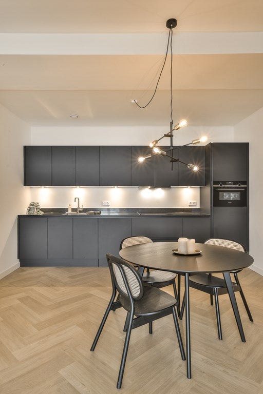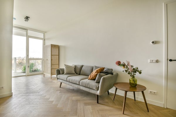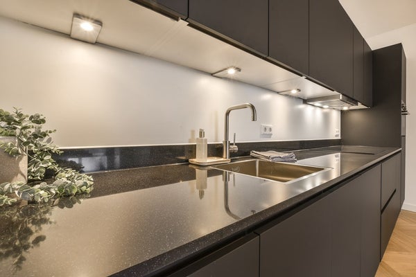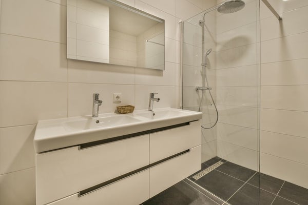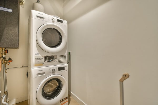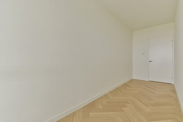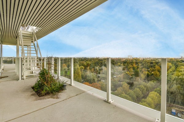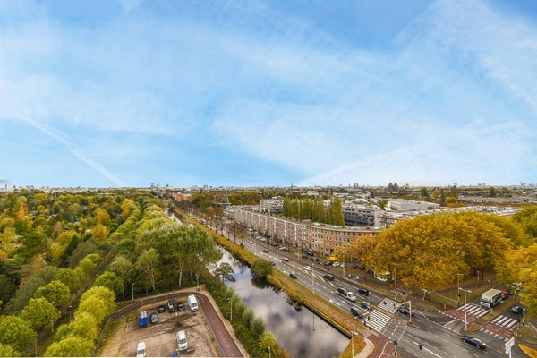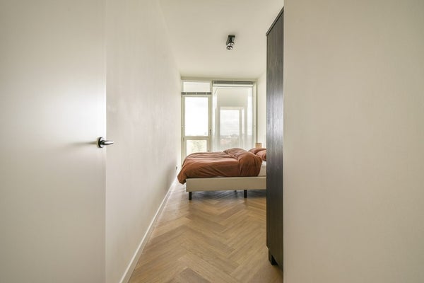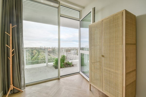 L'appartement au 11e étage est accessible par ascenseur via l'entrée commune au rez-de-chaussée. Le salon est lumineux et relié à une cuisine ouverte entièrement équipée. Le couloir donne accès à la chambre principale avec un lit double et une armoire. La deuxième pièce peut servir de chambre à coucher, de chambre d'enfant ou de bureau. Le salon et la chambre donnent accès à un balcon avec vue sur Westerpark et Amsterdam. La salle de bain comprend un double lavabo, une douche à l'italienne et des toilettes. Il y a également des toilettes séparées dans le couloir et un débarras avec un lave-linge et un sèche-linge. Toutes les pièces sont équipées du chauffage au sol, et l'appartement est fini avec un sol en PVC à chevrons. Une place de parking peut être louée moyennant un supplément.