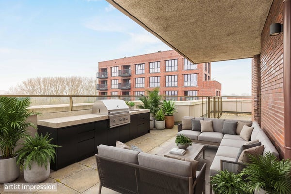 Le salon est caractérisé par d'imposantes fenêtres du sol au plafond qui laissent entrer une abondance de lumière naturelle et créent une sensation d'espace et de liberté. Les portes pliantes complètement ouvrantes assurent une transition fluide vers la terrasse ensoleillée orientée à l'ouest – un espace extérieur exclusif où vous pouvez profiter de longues soirées de détente en toute confidentialité.