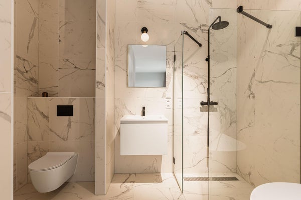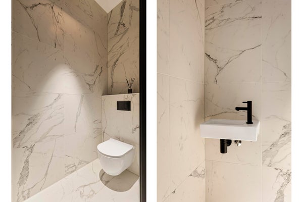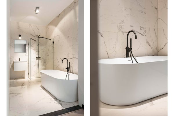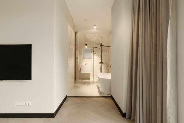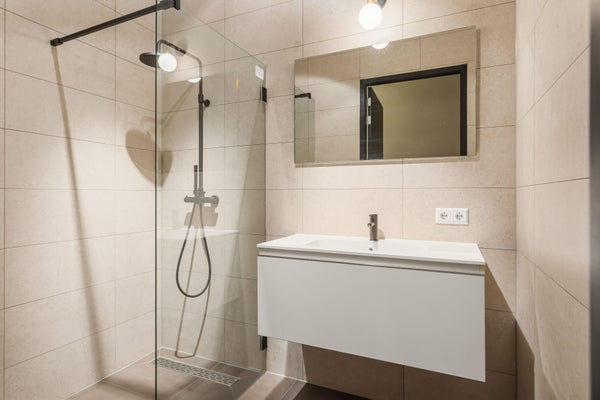 Un couloir séparé vous mène aux trois grandes chambres, aux deux luxueuses salles de bains et au débarras interne avec lave-linge et sèche-linge. La chambre principale est aménagée comme une suite privée, dotée d'une salle de bain attenante, d'un grand dressing et d'un accès direct à la terrasse. Les deux salles de bains sont finies avec des matériaux de qualité, des accents en pierre naturelle et un aspect moderne et intemporel.