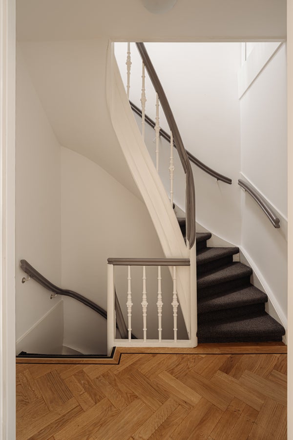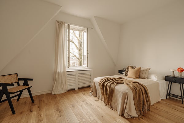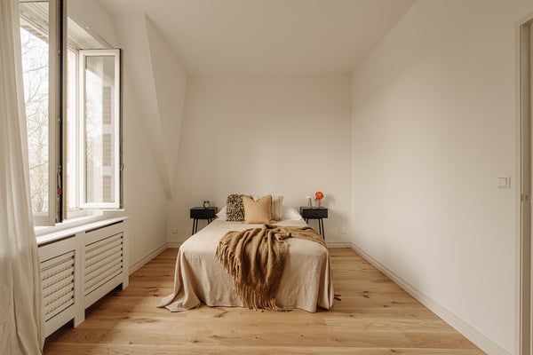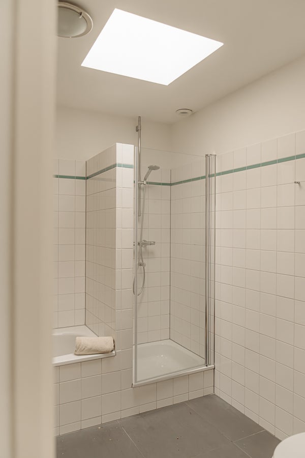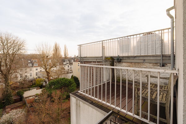 Le quatrième étage comprend deux chambres spacieuses, la chambre principale donnant accès à une terrasse ensoleillée d'environ 5 m². La deuxième chambre est située à l'avant et dispose d'une fenêtre de lucarne. La salle de bain est placée au centre et est équipée d'une baignoire, d'une douche séparée et d'un double lavabo. De plus, cet étage comprend une buanderie et un dressing.