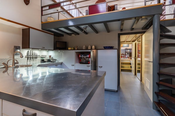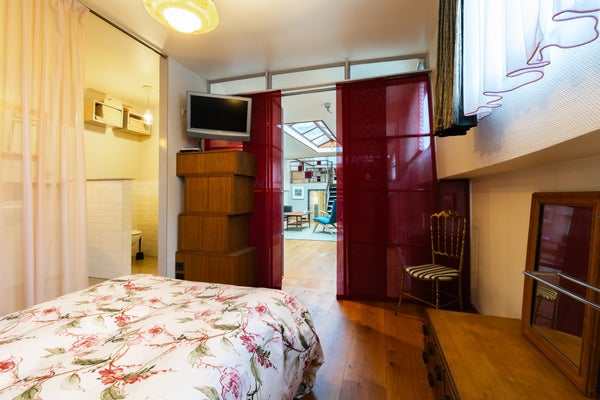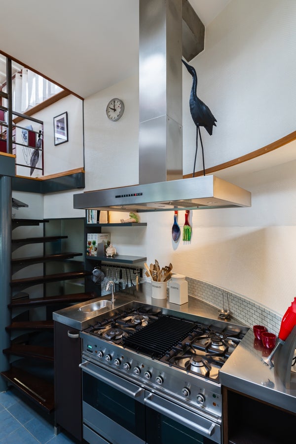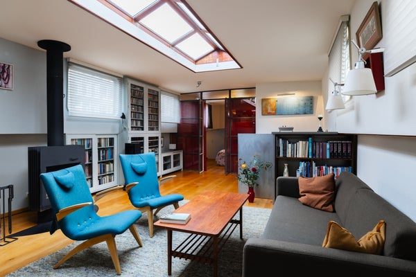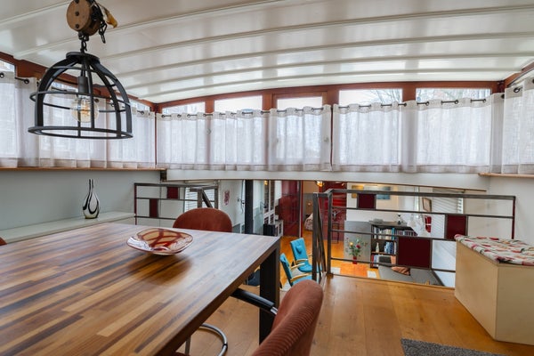 Dès l'entrée, l'espace est immédiatement perceptible. La propriété dispose d'un salon généreux avec de hauts plafonds et de grandes fenêtres, créant une lumière agréable. Le coin salon est en contrebas et offre une atmosphère intime et confortable, tandis que la salle à manger surélevée surplombe le salon et le canal. Ces différences de niveau ludiques créent une sensation spéciale et loft.