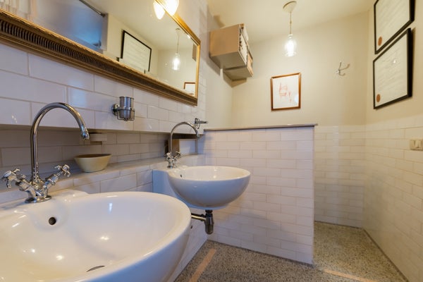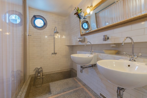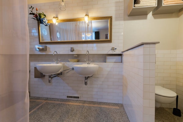 La chambre est située au calme et offre suffisamment d'espace pour un lit double confortable et un espace de rangement. La salle de bains est élégamment finie et dispose d'une douche à l'italienne, d'un double lavabo et de robinetterie de luxe. Il y a aussi des toilettes séparées.