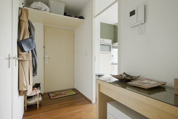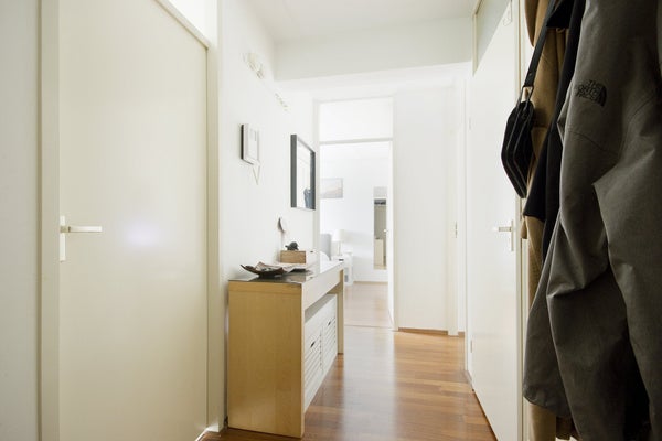 En entrant dans l'appartement, vous arrivez dans un petit hall qui mène à toutes les pièces. Il y a de la place pour ranger vos manteaux et chaussures, etc.
