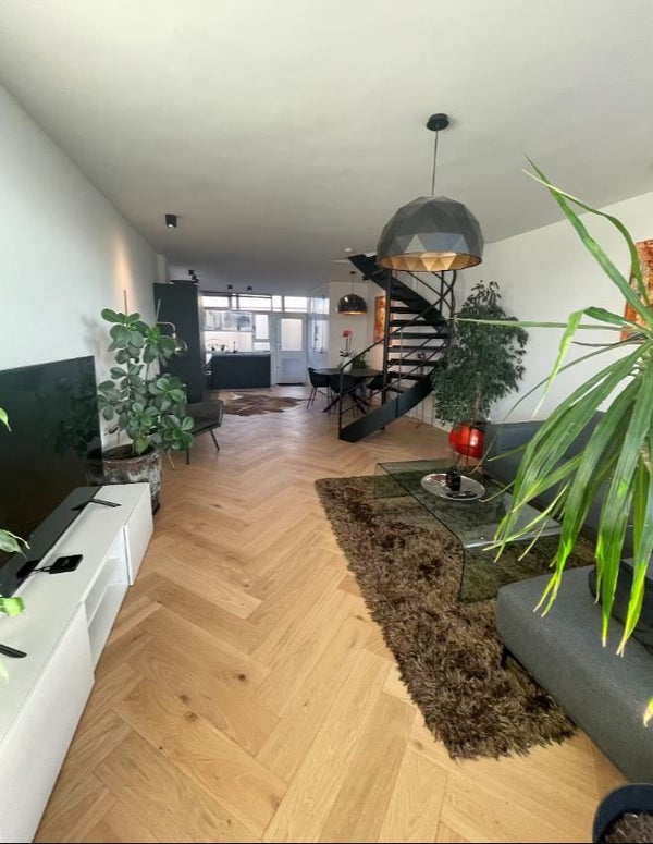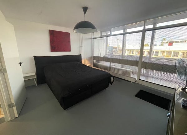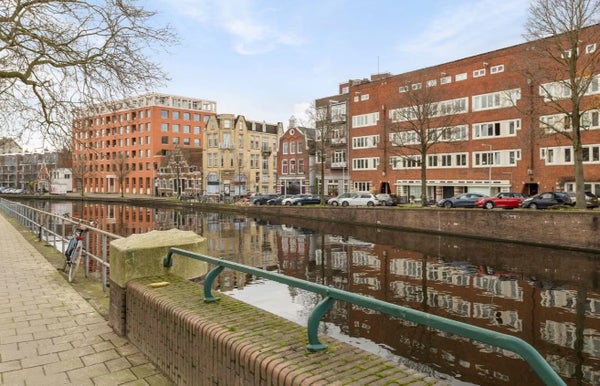 Grand salon côté rue avec une magnifique vue sur l'eau et la vie citadine d'Amsterdam.