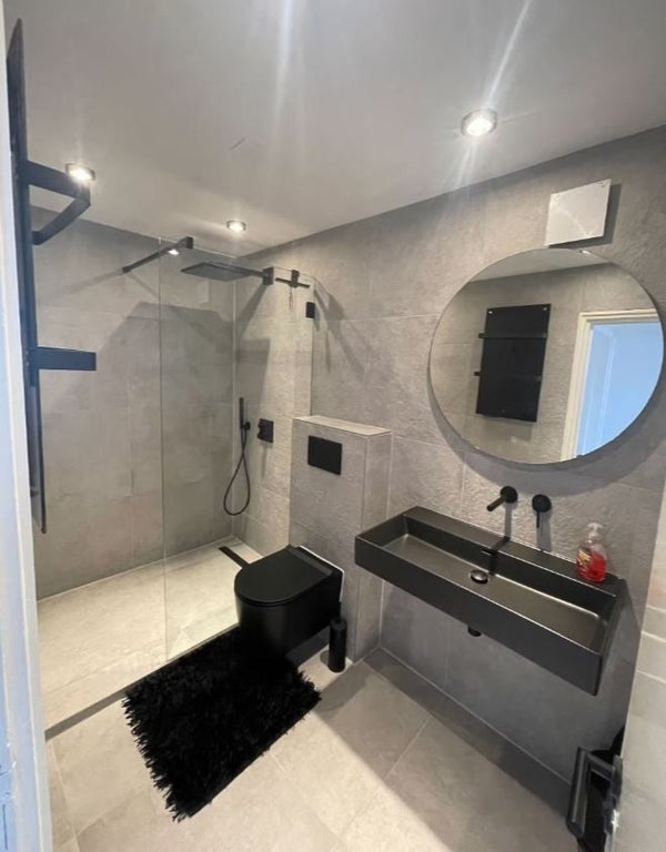 Salle de bain moderne noire/grise avec douche à effet pluie, spots noirs, robinets noirs.