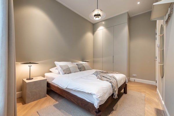 Il y a une porte moderne en verre/acier qui sépare le salon du couloir. À travers le couloir, vous trouverez la chambre principale, ici vous avez un confortable lit double où vous pouvez avoir une bonne nuit de sommeil ou simplement prendre du temps pour vous détendre. Dans la deuxième chambre, il y a un bureau solide avec une chaise de bureau confortable, ce qui assure également que c'est un endroit idéal pour travailler à domicile. Le placard intégré dans les deux chambres contient beaucoup de rangement pour votre garde-robe.