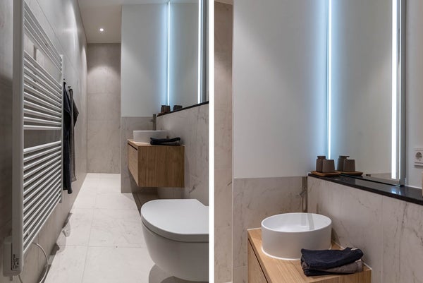 La salle de bain est également située à ce niveau de l'appartement. Elle dispose d'un lavabo moderne avec meuble, d'une toilette, d'une douche moderne et d'un chauffage de serviettes. Comme les toilettes séparées, la salle de bain est décorée avec les mêmes carreaux de marbre. À côté de la salle de bain, il y a une buanderie séparée avec un lave-linge/sèche-linge.