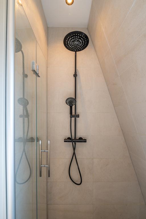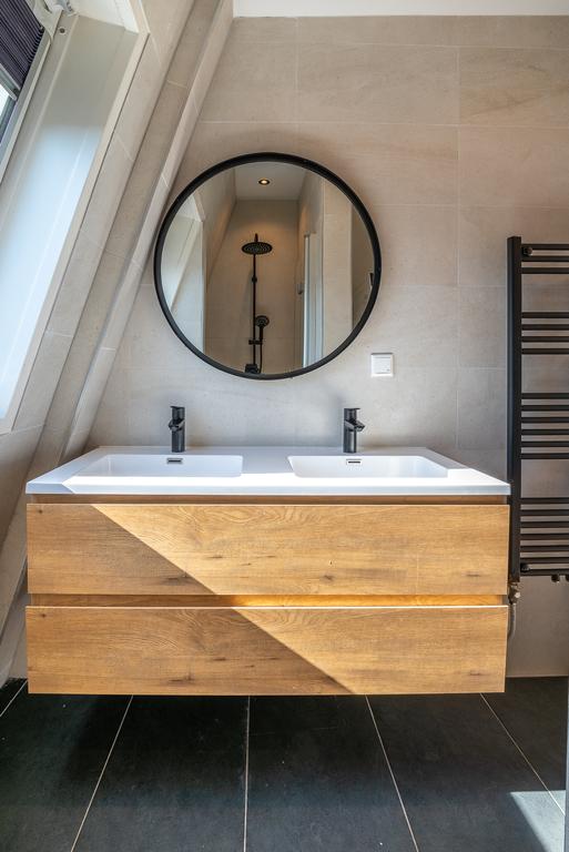L'escalier mène à la mezzanine qui donne accès à 3 chambres et une salle de bain luxueuse. La salle de bain est équipée d'une douche à l'italienne, d'un meuble lavabo et d'une combinaison sèche-linge.