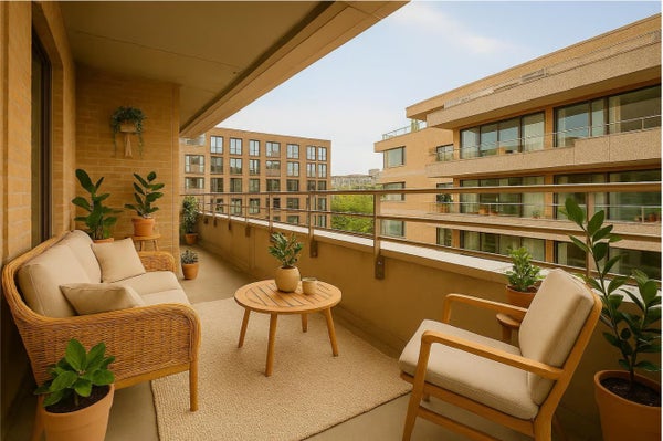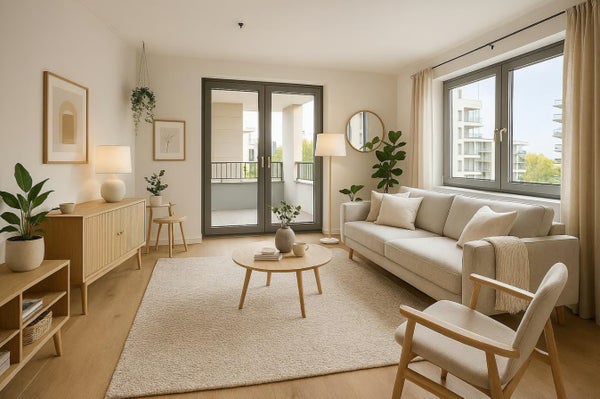 L'appartement a une surface totale d'environ 80 m². Toutes les pièces sont accessibles depuis le hall d'entrée. Le salon avec cuisine ouverte fait environ 33 m² et est entièrement équipé d'appareils électroménagers intégrés, y compris une plaque de cuisson, un four à micro-ondes combiné, une hotte aspirante, un réfrigérateur, un congélateur et un lave-vaisselle. Depuis le salon, vous avez accès au spacieux balcon d'environ 14 m². Les deux chambres mesurent environ 13 m² et 8 m². La salle de bain est équipée d'une douche à l'italienne, d'un lavabo avec robinets doubles et d'un radiateur porte-serviettes.