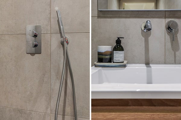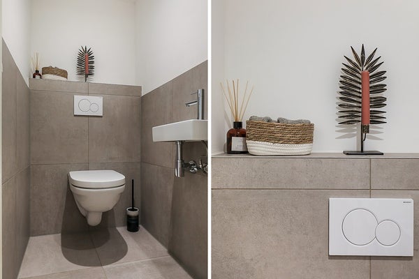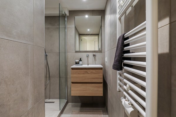 De l'entrée, il y a aussi un toilette séparé avec un petit lavabo. La deuxième salle de bain est équipée d'un radiateur au design moderne, d'un lavabo avec robinet intégré et d'une douche à l'italienne avec douche pluie.
