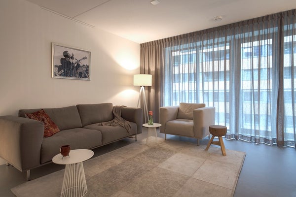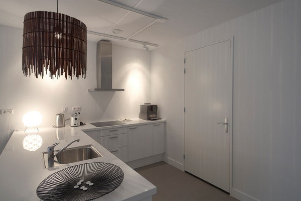 Depuis le hall central, toutes les pièces de l'appartement sont accessibles. Salon spacieux et lumineux à l'avant avec cuisine ouverte luxueuse et balcon attenant. La cuisine est équipée de divers appareils (encastrés), tels qu'un lave-vaisselle, un four / micro-ondes, une plaque de cuisson et un réfrigérateur. Depuis la cuisine, vous avez accès à la cave intérieure, où se trouvent la machine à laver et le sèche-linge.