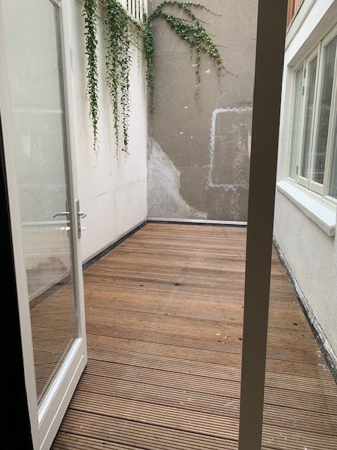 Un hall permettant d'accéder aux toilettes séparées et à la chambre située à l'arrière tranquille de l'immeuble. La salle de bain dispose d'une douche pluie séparée, d'un évier et d'un radiateur design.