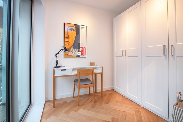 La pièce de vie à plan ouvert bénéficie de beaucoup de lumière naturelle grâce aux fenêtres du sol au plafond et aux portes d'accès au balcon. Tous les meubles de qualité ont été soigneusement sélectionnés et donnent à l'appartement une atmosphère chaleureuse et luxueuse.
