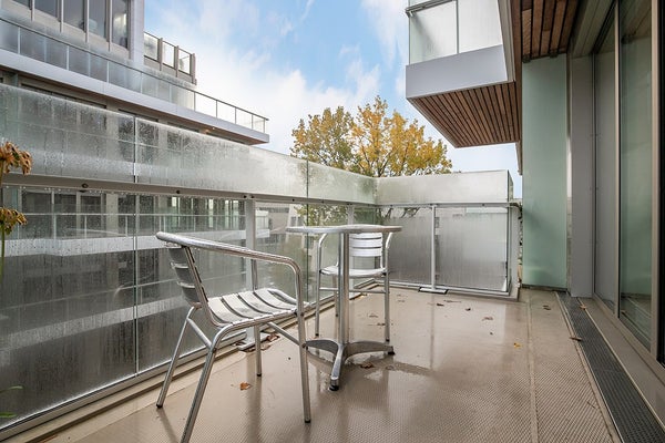 Le grand balcon est orienté à l'est (soleil du matin !) et offre une vue sur le jardin commun et l'eau sur la gauche.