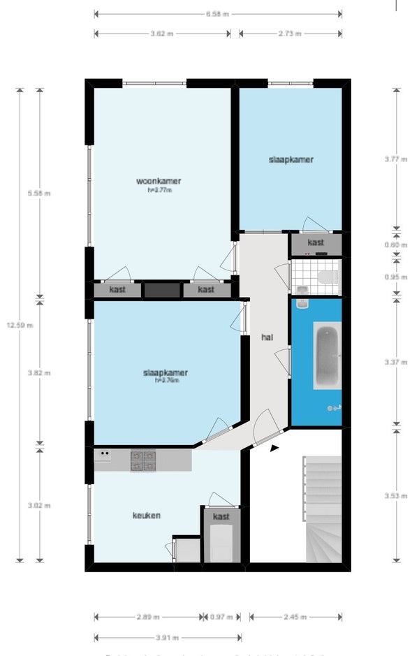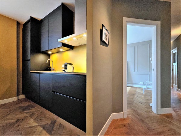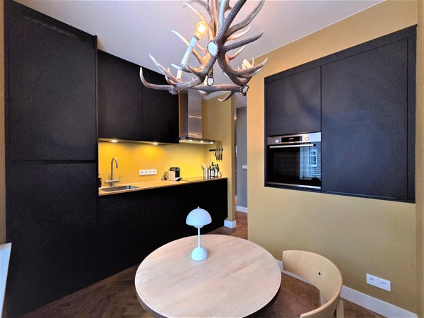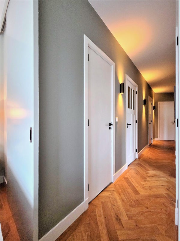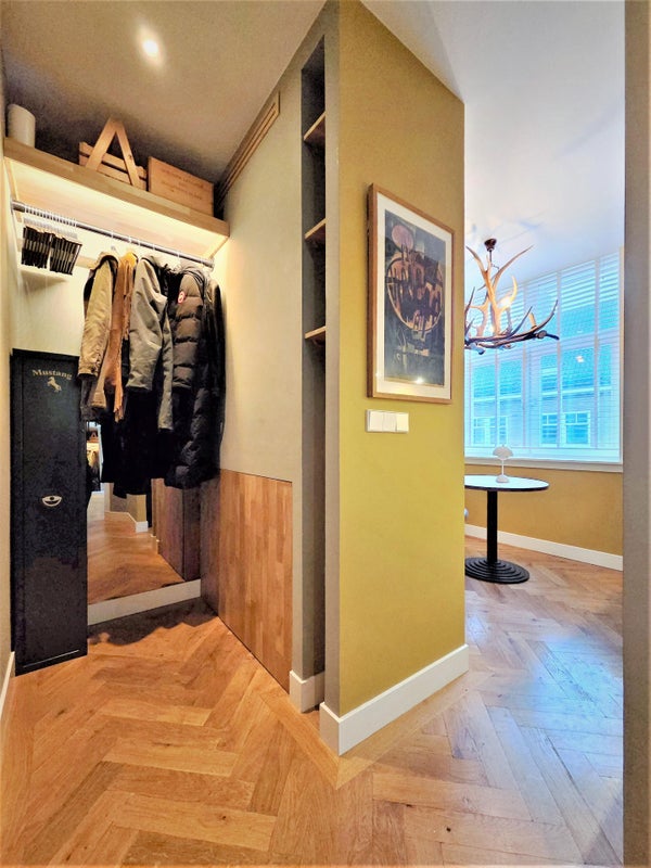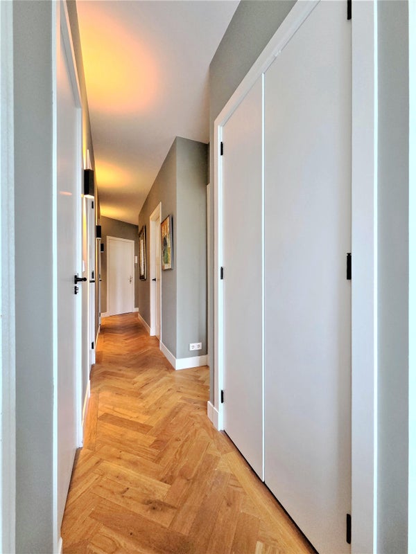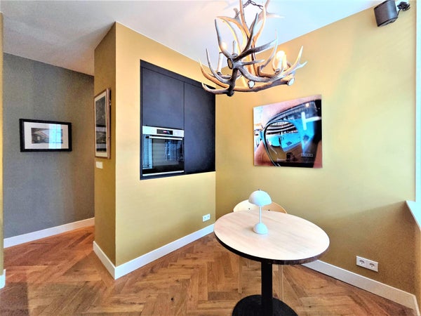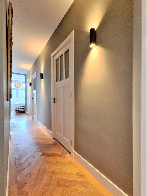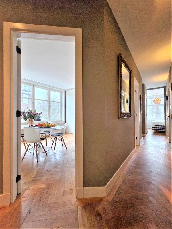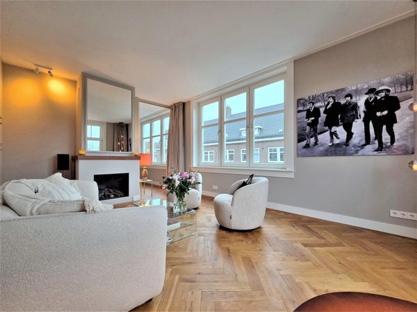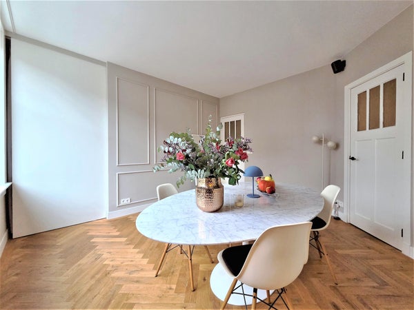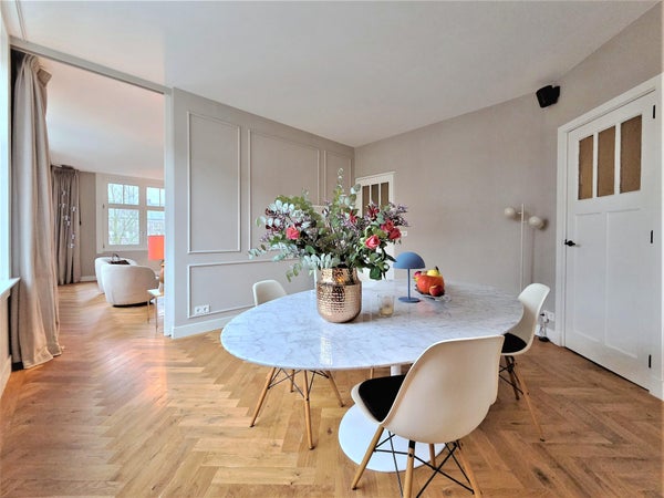 À l'avant, il y a le salon lumineux et atmosphérique. Grâce aux fenêtres à la fois à l'avant et sur le côté, la lumière du jour y pénètre abondamment, et vous profitez d'une vue dégagée sur le parc. La cheminée à gaz élégante procure chaleur et ambiance pendant les mois plus froids. L'appartement est également équipé d'un système Sonos dans toutes les pièces, pour un confort de vie supplémentaire.
