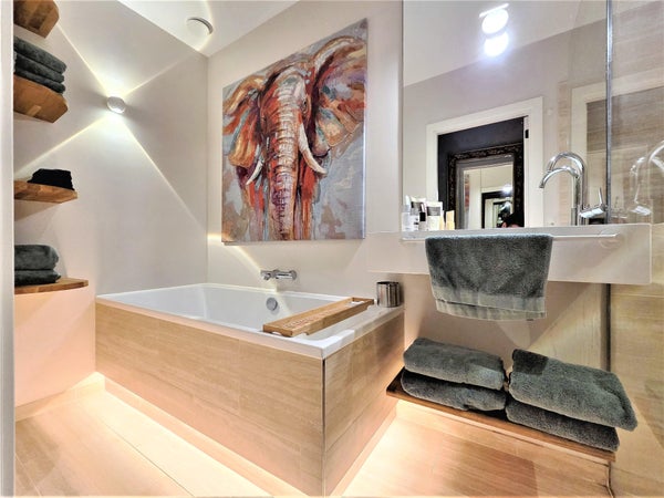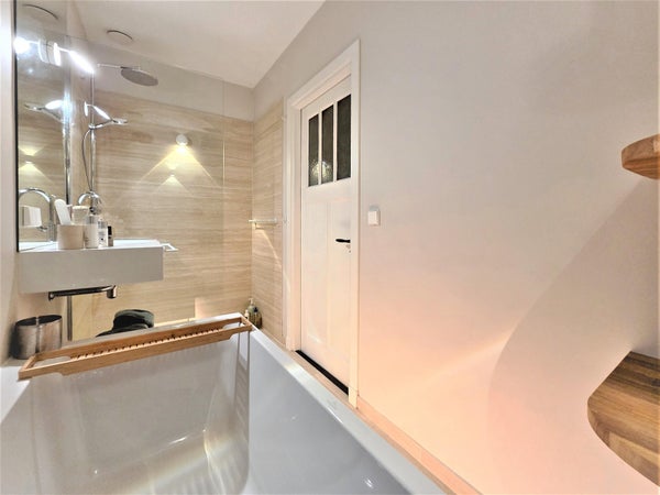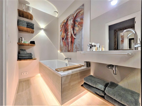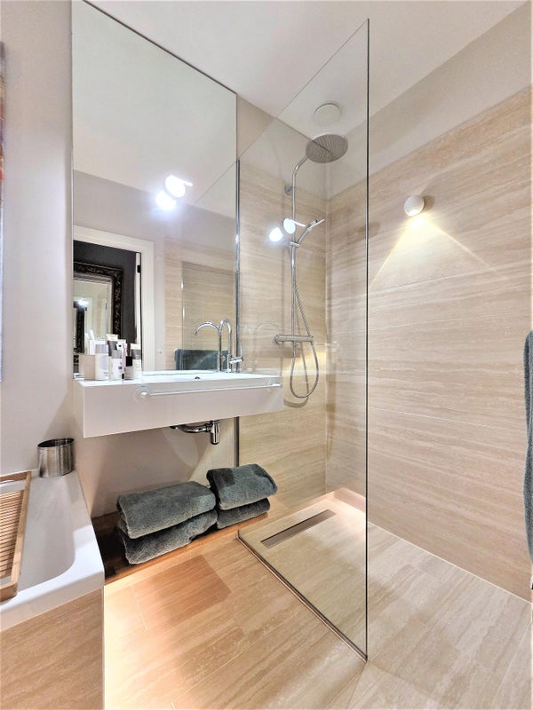 Attenant au salon se trouve la chambre avec un lit double, au calme et offrant suffisamment d'intimité. À proximité se trouve un dressing, un ajout très apprécié. De plus, il y a des toilettes séparées et une superbe salle de bain avec baignoire, large lavabo et douche à l'italienne spacieuse, un endroit agréable pour se détendre après une longue journée.