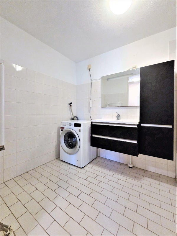 • Salle de bain avec douche à l'italienne, meuble vasque et lave-linge
