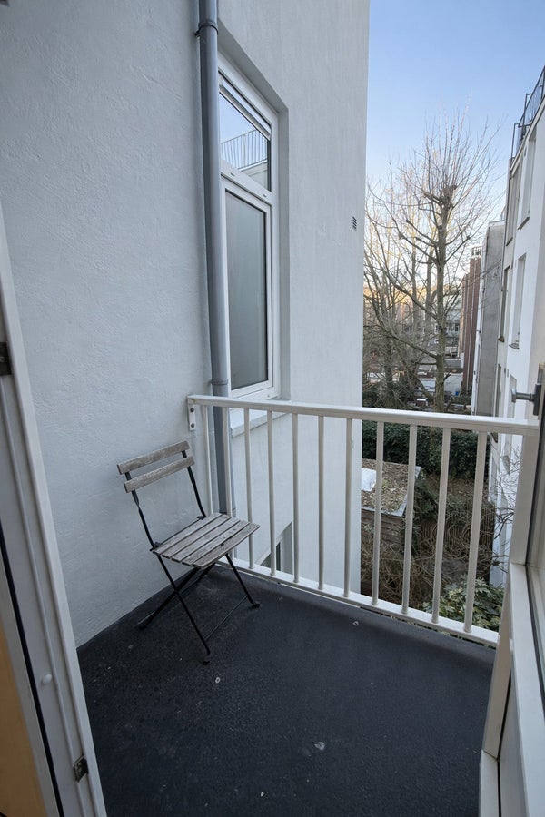 À l'arrière de l'appartement se trouvent la chambre et le deuxième balcon. Ce balcon orienté à l'est est situé à côté de la chambre, ce qui facilite l'accès à l'extérieur pour profiter du soleil du matin. La chambre est tranquillement située à l'arrière de l'appartement. Le lit montré sur les photos appartient au locataire actuel ; en concertation avec le propriétaire, un nouveau lit peut être fourni, ou vous pouvez choisir d'apporter le vôtre.
