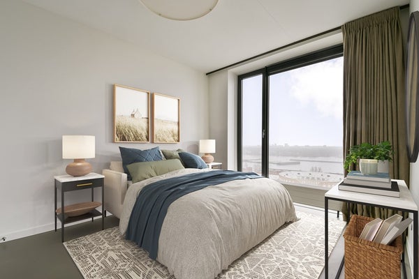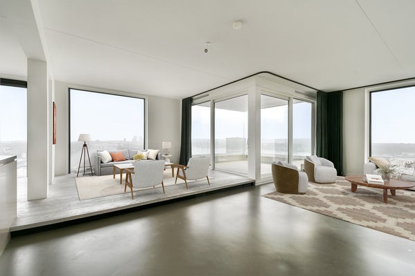 L'immeuble dispose d'une belle entrée avec deux ascenseurs. L'appartement est situé au 18ème étage du bâtiment. Entrée avec couloir et vestiaire. Salon très spacieux et extrêmement lumineux avec une vue spectaculaire sur la ville et l'eau. Cuisine moderne avec appareils intégrés et espace de rangement suffisant. À côté de la cuisine se trouve la grande terrasse. La terrasse bénéficie d'une excellent ensoleillement et offre une vue sublime sur la ville. De l'IJsselmeer, du centre-ville, de la Zuidas, et même jusqu'à l'ArenA, la vue reste spectaculaire.
