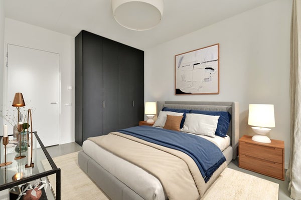 Au début du couloir, il y a un accès à la chambre principale. Cette chambre est dotée de belles fenêtres et est équipée de placards encastrés spacieux, cette "chambre principale" dispose d'une salle de bain luxueuse avec baignoire, douche à l'italienne, toilettes et meuble lavabo. La deuxième et la troisième chambre sont également spacieuses et donnent également sur le côté de l'eau du bâtiment. À côté de ces chambres se trouve la deuxième salle de bain avec douche à l'italienne et lavabo. De plus, il y a des toilettes pour invités séparées et un vaste espace de rangement pour lave-linge.