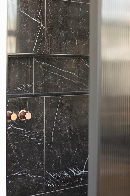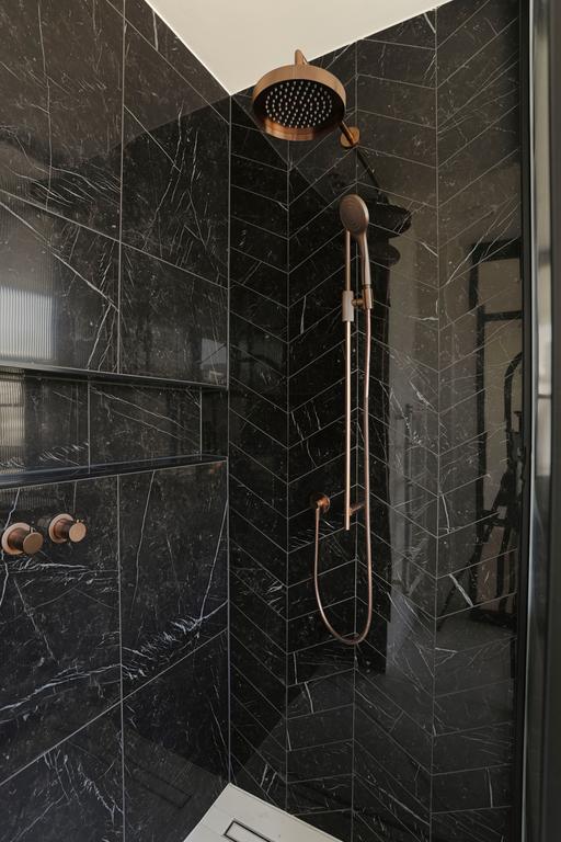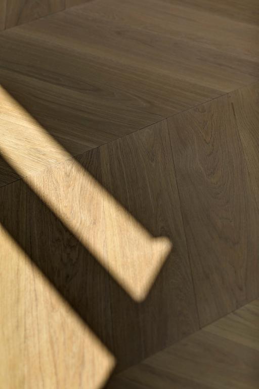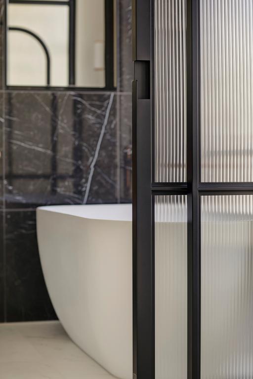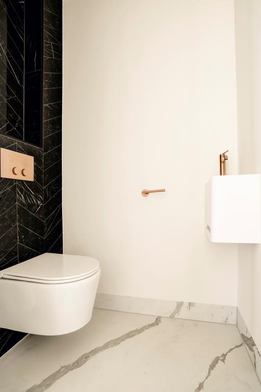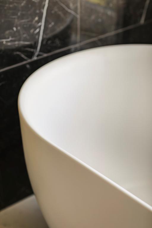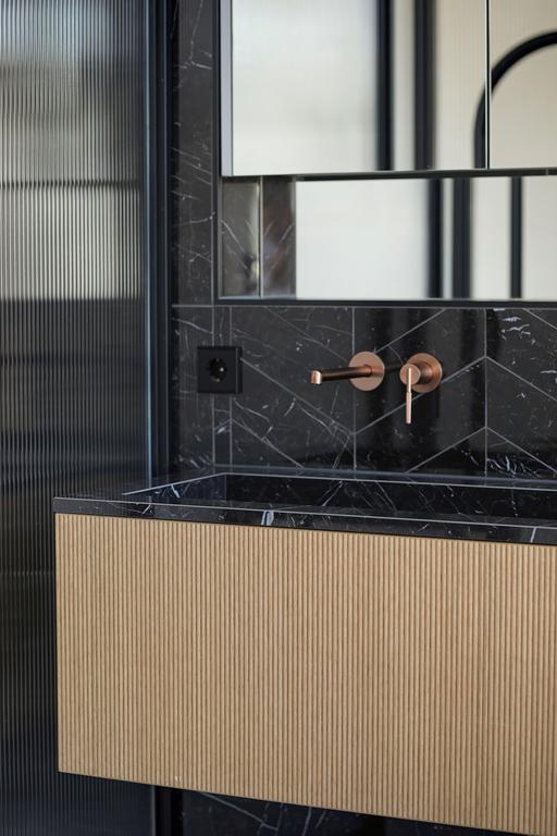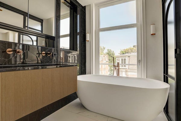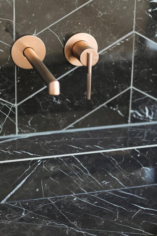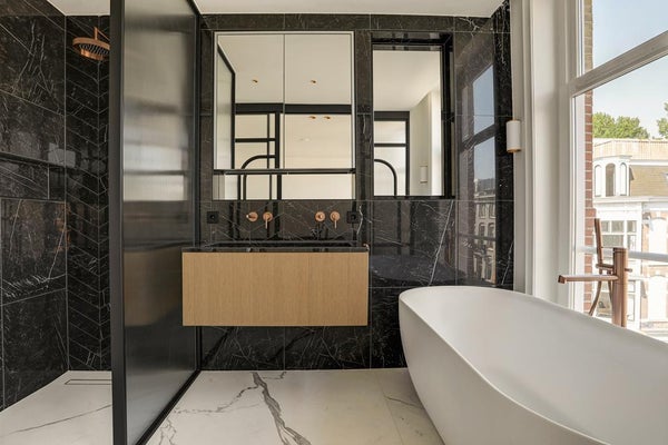 Alors que des teintes claires dominent dans l'appartement, des teintes plus foncées sont utilisées dans la salle de bain. Les murs de la douche et du lavabo sont recouverts de carreaux muraux sombres. En alternant ceux-ci avec un point hongrois et un lien croisé, un effet ludique se crée. Pour les autres murs et le sol, des carreaux en céramique blancs avec une veine grise claire ont été choisis, qui, avec les robinets en bronze, assurent une apparence chic. Le contraste clair-foncé est également présent dans le meuble lavabo : tiroirs en bois striés clairs et un plateau en marbre noir. La baignoire indépendante, la douche séparée et le double lavabo complètent l'ensemble.