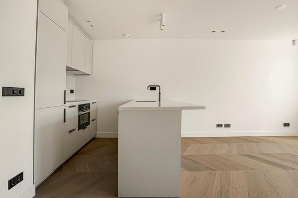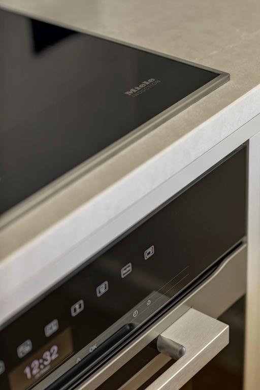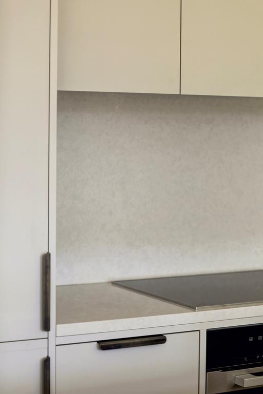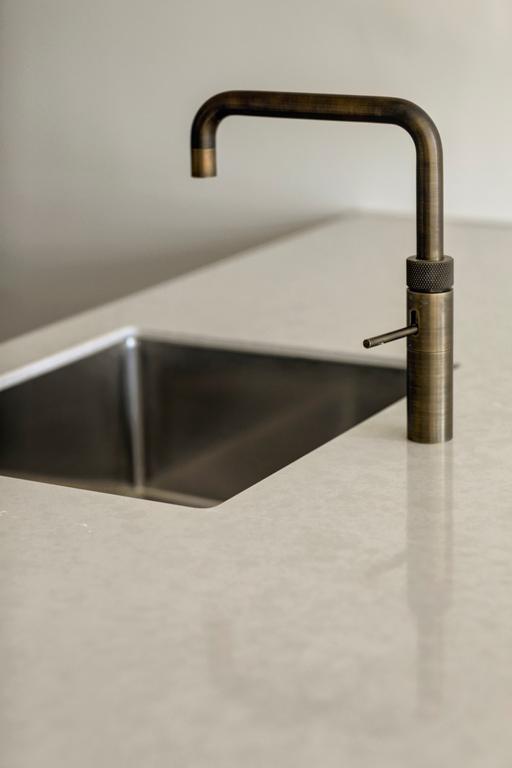 La cuisine est une combinaison de façades de cuisine gris clair mat, un plan de travail fin en composite de couleur sable avec de légères veines où l'évier se prolonge. Un robinet Quooker en laiton complète cette cuisine ton-sur-ton et lui donne un aspect unique qui s'intègre parfaitement à l'atmosphère du reste de l'appartement.