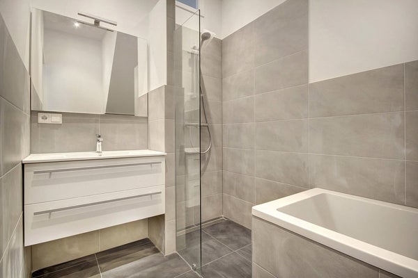 La salle de bain est entièrement équipée avec une baignoire, un lavabo et une douche à l'italienne. Les toilettes se trouvent à part.