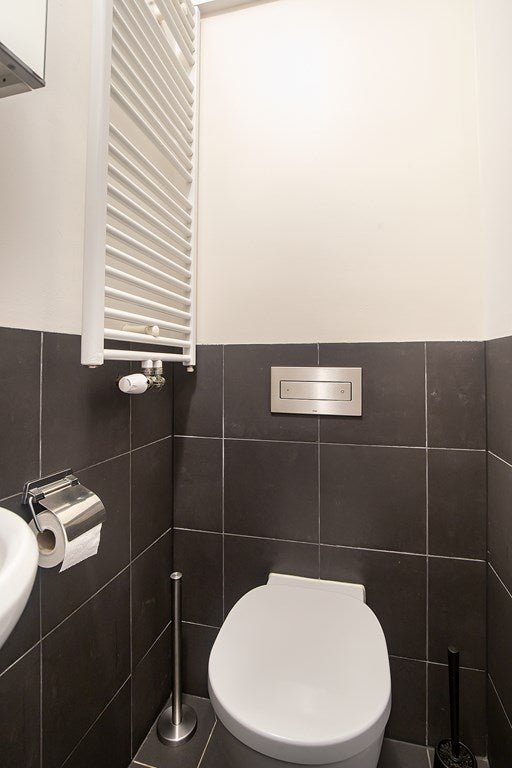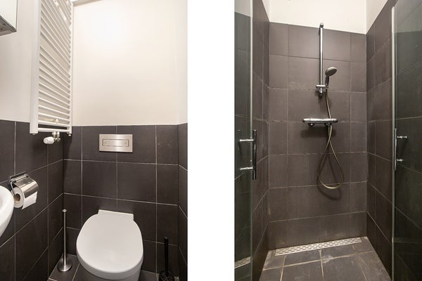 Par l'escalier commun, vous accédez au premier étage, avec une entrée dans le couloir qui donne accès au salon avec un coin repas séparé. La cuisine est équipée de tous les appareils encastrés souhaités. Par le couloir, vous accédez aux deux chambres, à la salle de bains et aux toilettes séparées.