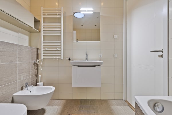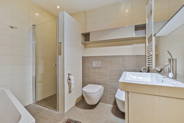 La salle de bain luxueuse est finie avec des matériaux de haute qualité et des touches modernes, y compris une grande douche à l'italienne, une baignoire autoportante, un toilette et un lavabo. C'est l'endroit idéal pour se détendre après une journée de travail bien remplie ou pour se rafraîchir avant de sortir pour une nuit en ville.