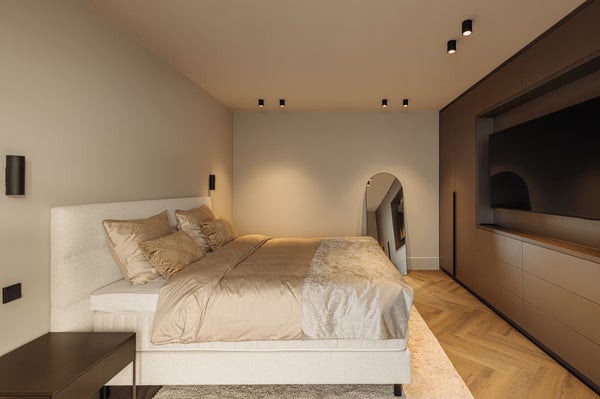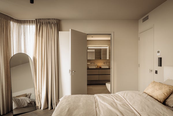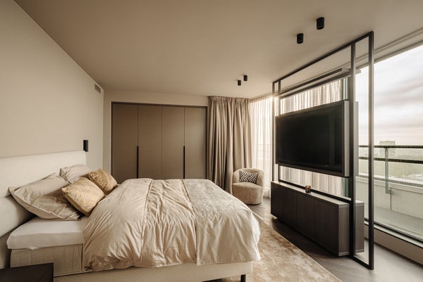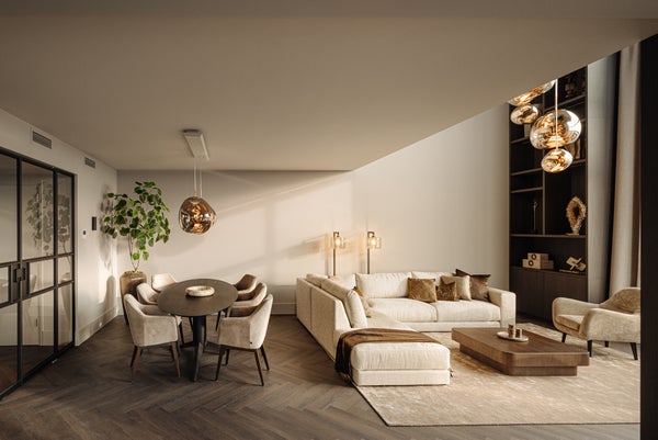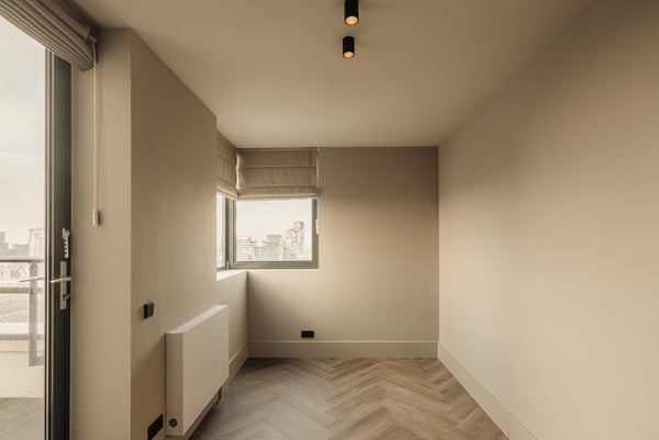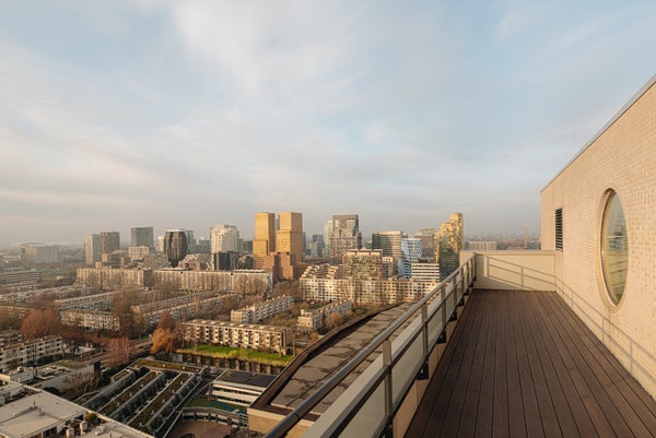 L'appartement dispose de trois chambres, deux salles de bains et d'une cuisine ouverte avec un îlot central. Le spacieux espace de vie, avec une hauteur de plafond allant jusqu'à 5,5 mètres, est lumineux et aéré, s'ouvrant sur une terrasse orientée à l'ouest, idéale pour le soleil de l'après-midi et du soir. Depuis l'appartement, vous pouvez profiter de vues panoramiques sur Schiphol, la Zuidas et la ville d'Amsterdam. La résidence est accessible par un ascenseur privé, garantissant une confidentialité et une commodité maximales.