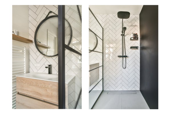 La chambre dispose d'un placard intégré et donne accès au balcon. La salle de bain est équipée d'une douche à l'italienne, d'un meuble lavabo et d'un radiateur à serviettes. Toilettes séparées, accessibles depuis le hall.