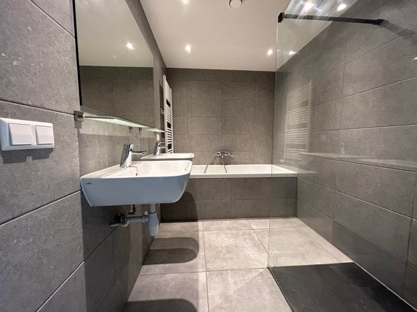 Entrée avec interphone. En face de l'entrée se trouve la salle de bain de luxe avec douche à l'italienne, baignoire et double lavabo. Revêtue de luxueux carreaux en pierre naturelle grise. Toilettes séparées. Le salon lumineux est situé du côté de la sympathique Middenweg et dispose de magnifiques fenêtres à battant. Dans le salon, se trouve la cuisine moderne, équipée d'un îlot de cuisson et de tous les appareils de luxe.